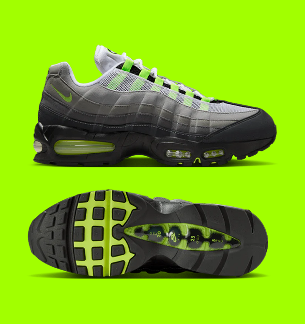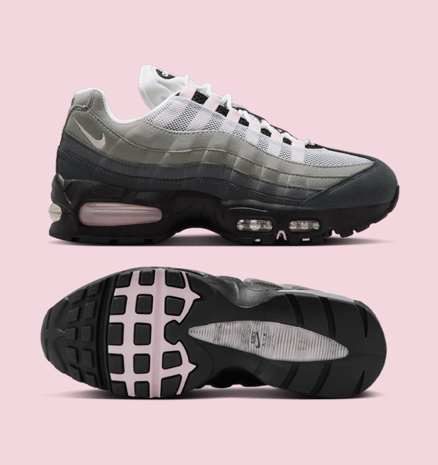 Originally inspired by the human anatomy, the Air Max 95’s design mimics the structure of the human body—layered mesh and synthetic panels reflect muscle fibers and skin, while the sculpted midsole represents the spine. It was also the first Nike sneaker to feature visible forefoot Air, pushing innovation to new heights.