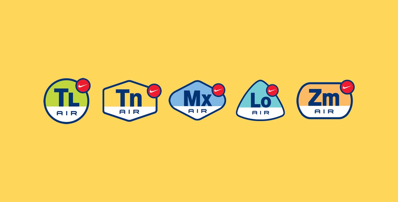 This project came across my desk as a need but all individual Air logos at different times a few weeks apart. It finally occurred to me that while I had good solutions for each as I explored them it would make more sense to have all Air logos work as a system since they were all the same technology group. My boss who was the creative director at the time was receptive to my concept that these would all be much like a periodic table of elements. Abbreviating the names to simple, concise 2 letter representations would also make them more iconic and take up less real estate on the footwear itself.