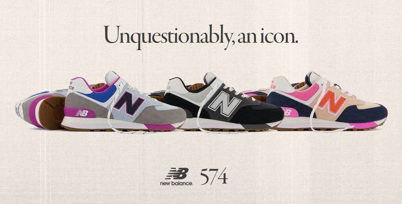 As a marked departure from the narrow racing silhouettes of prior generations, the 574 offered reliable comfort and stylistic versatility, in an unassumingly simple package. The 574 has defied trends and other artificial distinctions to become a fixture in closets all over the world.
