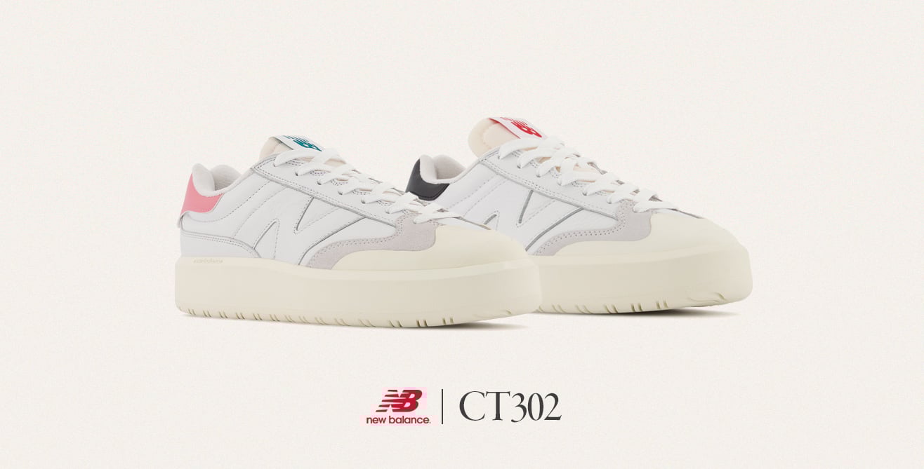 Using a 1980s on-court model, the CT300, as a launching point, the CT302 adds a stacked height midsole, an outsized take on the classic cup outsole design and ‘N’ logo, and a rubber toe wrap extending from the outsole, along with the use of curved and wavy lines throughout the design.