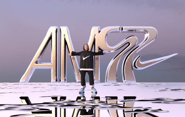 As for the Air Max ‘97 Bullet, Nike invites sneakerheads the world over into a chromatic greyscale colourway, with the signature Bullet silhouette and textural piping. Scumboy says, “My favourite part is the bubble sole. It’s become so subtle and slick in this edition, and shows this streamlined evolution of the iconic bubble feature. The name ‘Bullet’ is perfect in describing the sharpness of the silhouette, too.” If you have seen Scumboy’s work, you will know that silver and grayscale hue application has been a thread running through his work - with the ‘97 Bullet, we see another parallel between Scum’s World and Nike’s World. On the tacticility of this drop Scumboy says, “I have a blessing or a curse, where I am always analysing everyday objects. I see things in maps, which is how you work in 3D, where you overlay roughness, bump - texture - light - and when I analyse this sneaker, I am blown away by the different layers of construction, and the flow of contrast material and texture. There is even a section of mesh, which reminds me of chainmail for a knight’s armour. It’s just a crazy innovation, and when I wear them I always wear full black so that the Air Max ‘97 can be the star.”